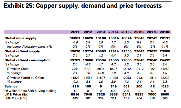 基于种种分析,高盛认为2015年对于铜来讲又将是艰难的一年,即使中期来看,价格也不太有可能上升。但是长期来看,目前这一阶段正是在为远期价格回升做准备,高盛预计2017-2018年铜价会有所上涨。图为高盛对未来几年铜价的预期: