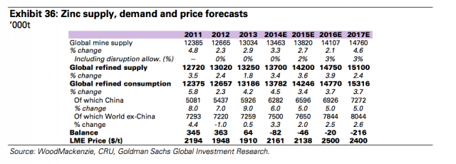 高盛预计2015年锌价小幅下滑,随后的2016、2017年,锌价将有较大幅度的提升。
