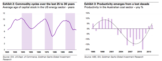 高盛对此前几轮大宗商品周期的分析显示,生产力方面的增长还将持续相当长的一段时间,这能够抵消近期牛市中的效率损失(如图)。这样一来,工业成本曲线就将转而下行,并趋于平缓。