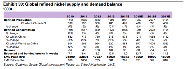 高盛对镍的前景比较乐观,认为目前的价格暗示了一个非常好的买入机会,尤其是相比于铜来讲。虽然高盛下调了短期(3-6个月)镍价预期,但是12个月内的价格预期并未调整,并预计更长一段时间内价格会有所上升。