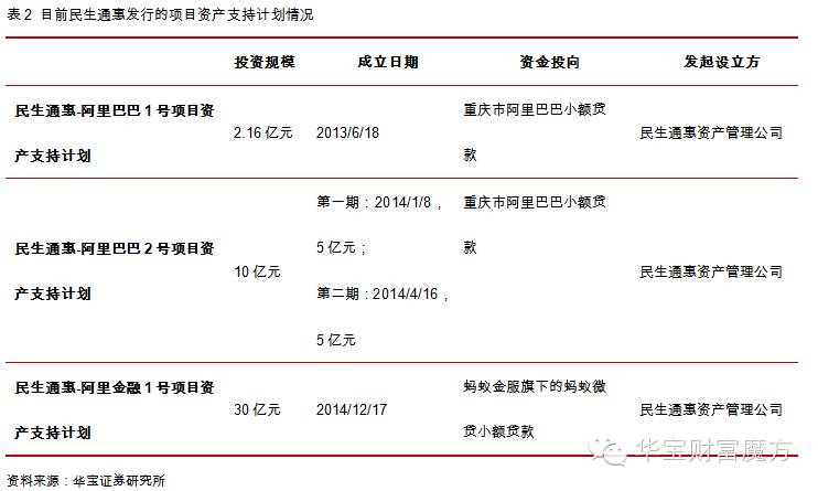 目前,民生通惠资产管理公司在项目资产支持计划产品的创新设立方面成绩喜人,位于同业前列。自保险新政出台后,民生通惠已发行3款项目资产支持计划,分别为民生通惠-阿里巴巴1号项目资产支持计划、民生通惠-阿里巴巴2号项目资产支持计划以及民生通惠-阿里金融1号项目资产支持计划。