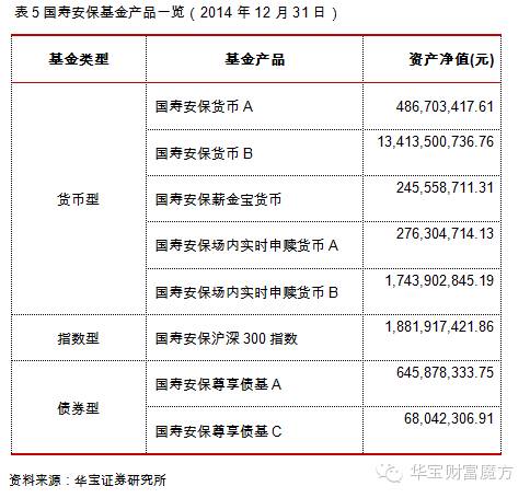 目前,国寿安保基金已经成立一年多,基本完成了货币、指数、债券等基金产品布局。截止2014年12月31日,国寿安保旗下共计8只基金,资产净值总计达187.6亿元。国寿安保基金目前主要在固定收益领域布局产品,主动管理型权益类基金产品尚未涉足,这也从侧面反映出保险系基金公司谨慎的一面。