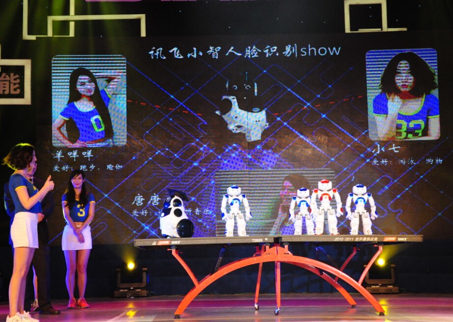 在讯飞研究院智能机器人研发团队负责人和四位美女的怀抱下,机器人小智和小柔登上了年会舞台,它们有板有眼地介绍起自己,似乎一点都不“紧张”。