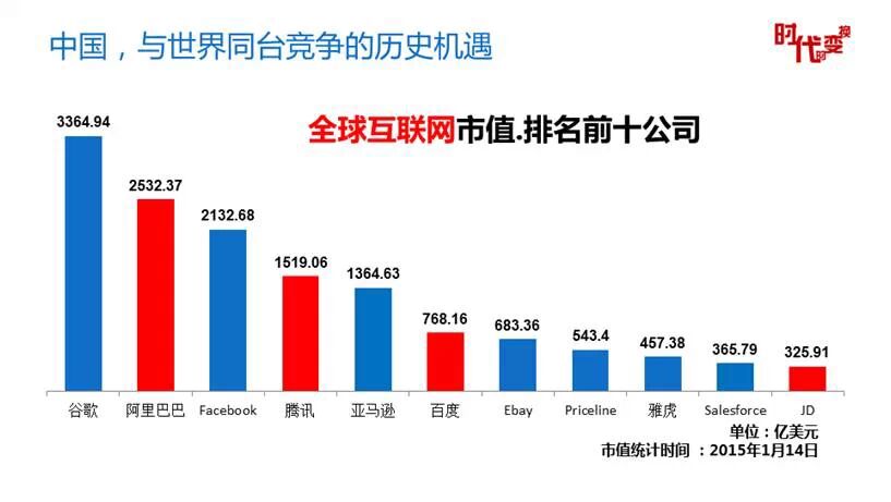 这也是中国,与世界同台竞争的历史机遇。在全世界互联网市值排名前10的企业中有4位是中国,他们是阿里巴巴、腾讯、百度和京东。