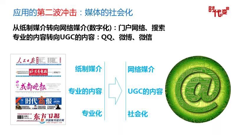 应用的第二波也已经完成了,就是对媒体的冲击。在座的有很多还是传统媒体行业中,但是这一波实际上早已经完成了。通过门户网站、搜索以及QQ、微博、微信这几波取代已经转换完成了。