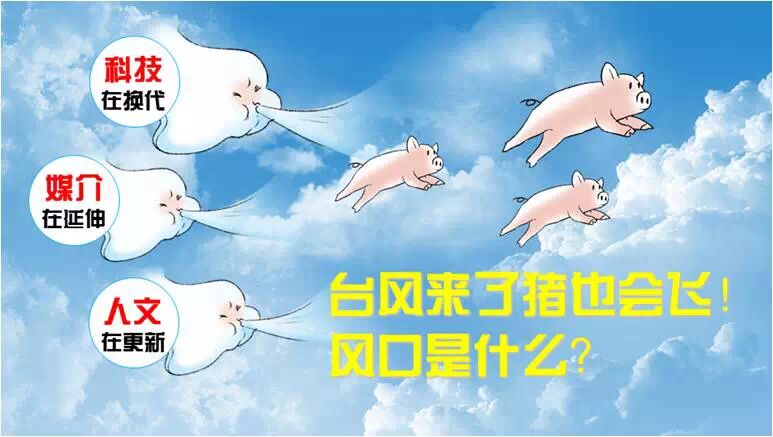 在2013年下半年开始,全中国以正和岛为代表公众号中就开始讨论到底什么是互联网思维?大家都把这个功劳归到了“技术”,实际上我看到的台风并且不是一股,而是三股,而且真正的台风是“人文在更新”,这是猪飞上天的最大台风。