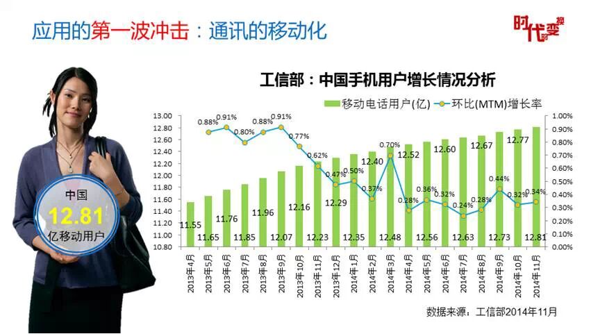 应用第一波我们看到的是通讯的移动化已经完成了,这是中国移动用户的数据。今天中国已经达到了12.81亿的用户,中国的人口多说有14亿。把老年人和小孩去掉以后,人手一部手机都不止。不要再指望中国移动用户再往上增加了,已经到顶了!移动互联网的人口红利已经完成,每个月增长都是0.5%以下,所以第一波冲击已经完成了。