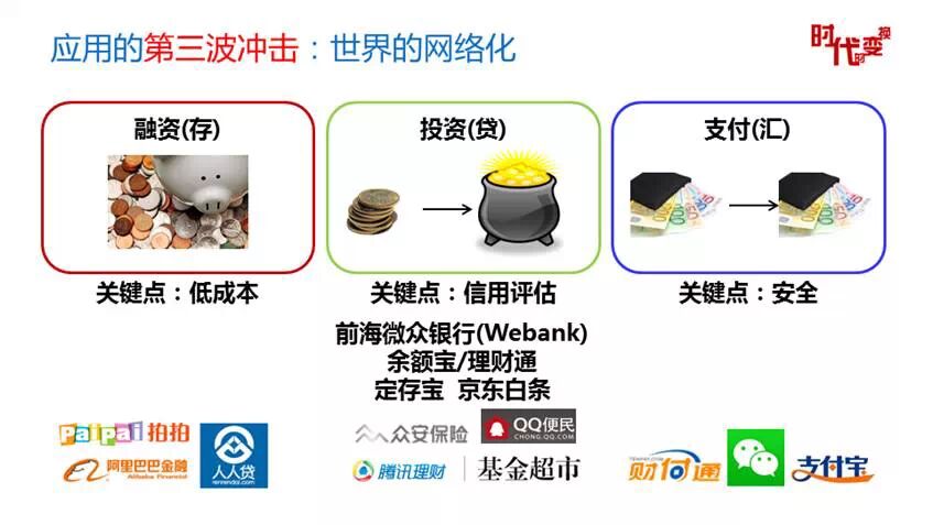 抛开具体数据不说,这些数据一定要变成钱,如果不跟钱挂钩,这些数据是没有意义的。互联网公司一定会发起抢钱的之争。2014年的各种“宝”大战,抢的只是货币基金这一点,今天我们看到了互联网的征信系统已经开始建立了,我们也看到了互联网银行已经要开始运行了。一个大国的崛起,一定是银行的地位下降,资本的地位上升,这就是中国腾讯飞的另外一个风口,移动互联网金融的这一部分,一定是另一个风口。当然“抢钱”的事情比较复杂,因为传统金融的实力还是非常强大的,前进的道路一定是曲折的。