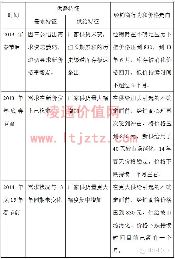 下表是12年-14年茅台三次价格下跌前供需关系状况,和价格变化结果统计。