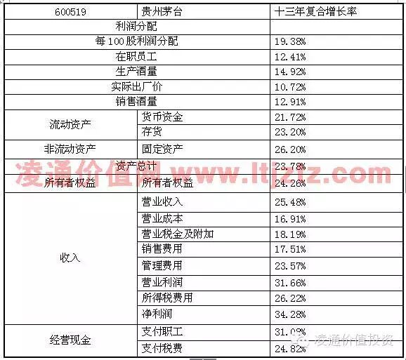 今天最基础的客观事实反映在一千元附近茅台的整个需求量在两万吨左右,大于实际供给,另一方面立足收入增长与高端消费品需求增长的一般经济规律,茅台作为高端消费品需求增长速度快于收入增长速度。茅台的长期增长速度最小是人均收入增长的二倍,在这样的一个增长态势下,茅台的民间需求长期增长率一定会超过三公。下图是助手帮我统计的2001年到2013年13年间,茅台主要财务指标的复合增长率: