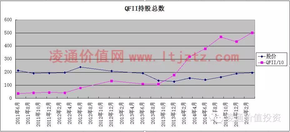 茅台总股本是11亿,但是其中有三分之二为茅台集团持有不参与市场流通,实际流通的股份只占总股本的三分之一,目前海外机构占茅台的实际流通盘的三分之一。下图是QFII对贵州茅台持股变化: