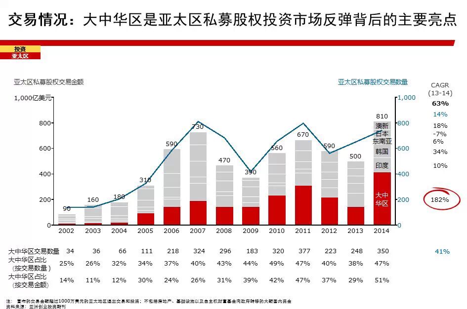 总体来看,2014年亚太区私募股权投资活动蓬勃发展,取得了有史以来的最佳业绩。同时,在亚洲最大的市场大中华区(中国大陆、台湾和香港)实现强势回归。据全球领先的管理咨询公司贝恩公司连续第四年发布的《大中华区私募股权市场报告》显示,市场交易额超过400亿美元,比2011年市场高峰期的交易额高出33%;交易量也比市场五年平均值高出30%,达到350笔。继阿里巴巴IPO募资250亿美元的辉煌之后,交易退出额也大幅激增,飙升至610亿美元,与2013年相比多了两倍。然而,这种积极的发展势头也是一把双刃剑,作为一个日益成熟的行业,市场对交易目标的竞争将愈加激烈,这意味着私募基金或者说基金管理人(GP)将必须加倍努力、提高自身创造力,以期在未来继续保持这一上升势头。