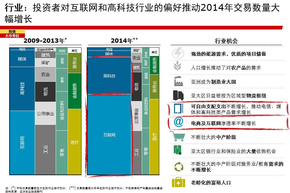 互联网和高科技行业的交易是2014年中国私募股权市场蓬勃发展的重要推手,约占总交易额的40%。另外,对高速增长目标展开的六宗金额过10亿美元的大额交易成为投资增长的最大助力,清理了部分“干火药”(即待投资现金),但余额仍处于较高水平。同时,上市公司私有化的交易在经历连续三年的高涨之后开始放缓。