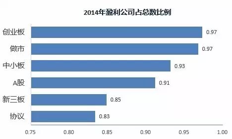 新三板整体盈利占总上市公司比例为85%,而一直与之相比的创业板这个比例达到97%,创业板446家公司中有434家公司处于盈利。