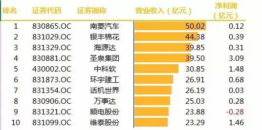 营收最高的南菱汽车,营业收入50亿元,第二名银丰棉花44.38亿元,第三名海源达39.85亿元。