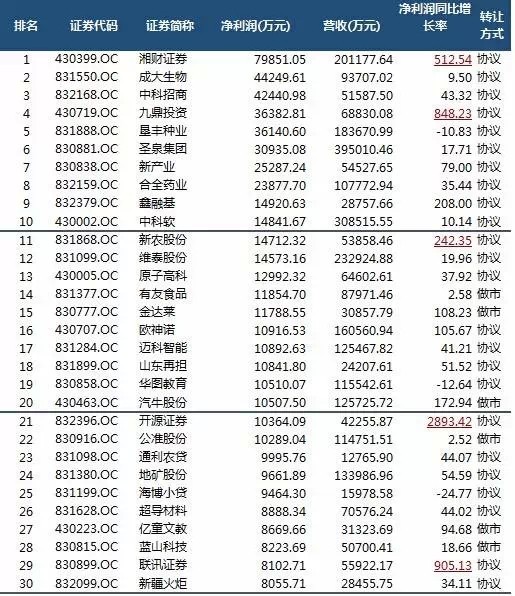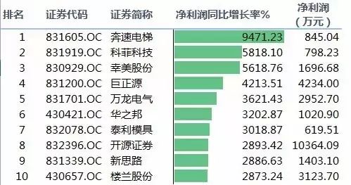 新三板挂牌公司净利润排名。