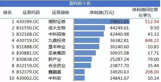 最赚钱公司当属湘财证券(430399),净利润79851.05万元,净利润同比增长率达到512.54%。成大生物以44249.61万元位居第二,中科招商以2000万之差位列第三。