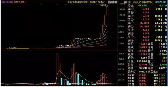 下图是百灵达国际(02326.HK)今天上午10:30分的K线图。当日上涨25%(这个涨幅丝毫不过分,因为前三个交易日,这个公司的日涨幅分别是42%、56%和39%)。