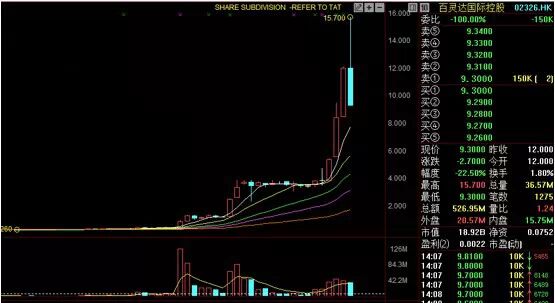 其实那只是刚开始,到今天(5月21日)上午,百灵达的股价已经达到了15块港币,市值300亿。股价翻了多少倍,我帮你算算吧:15/0.26=57.7倍,2个月,接近60倍的涨幅。公司从一个5亿市值的小公司,瞬间变成了300亿市值的牛逼公司——是不是像童话故事一样?