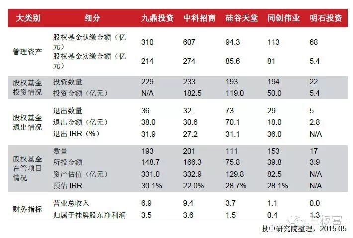 从业务规模来看,九鼎投资和中科招商量级较大,暂处于第一梯队;硅谷天堂和同创伟业量级中等,暂处于第二梯队;明石投资量级较小,暂处于第三梯队。