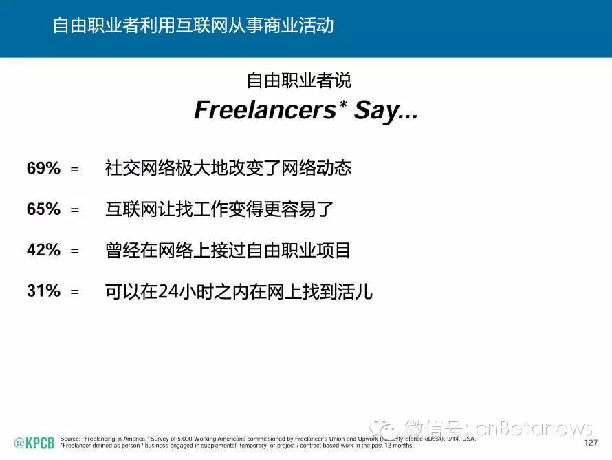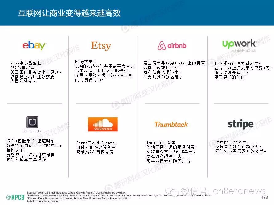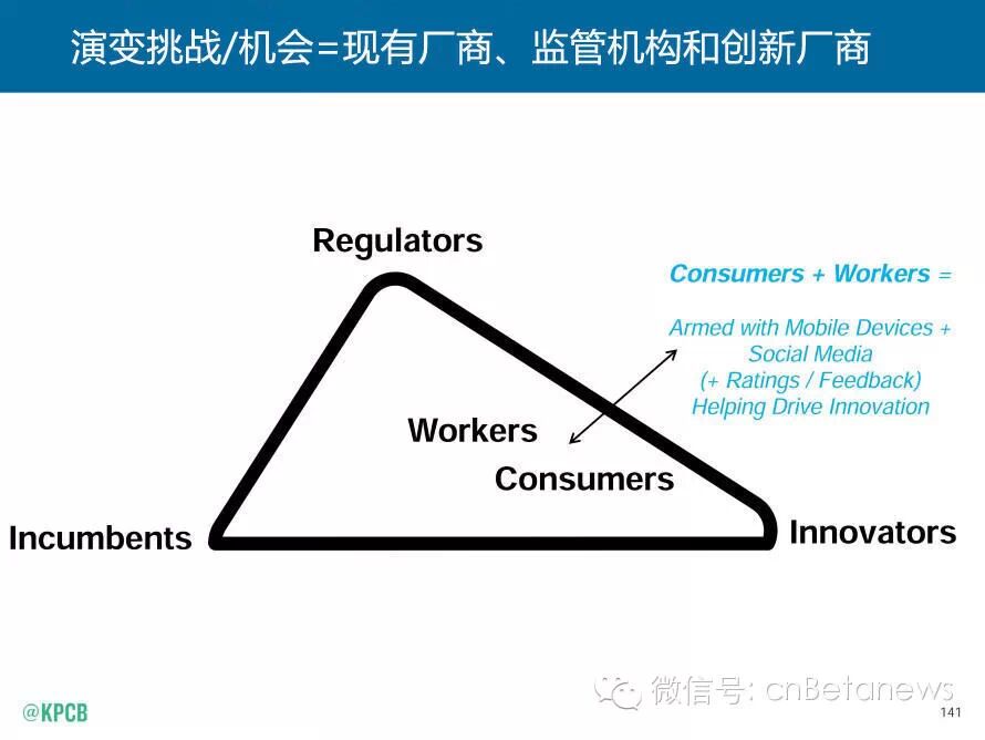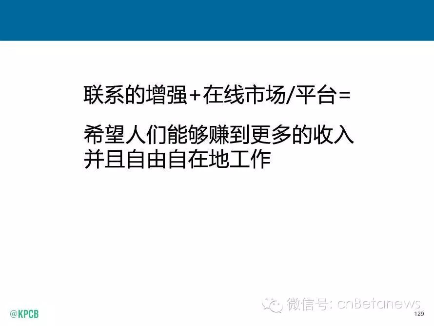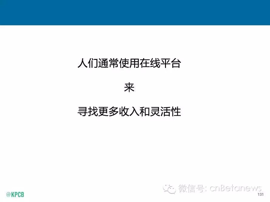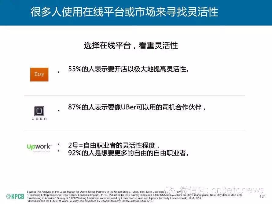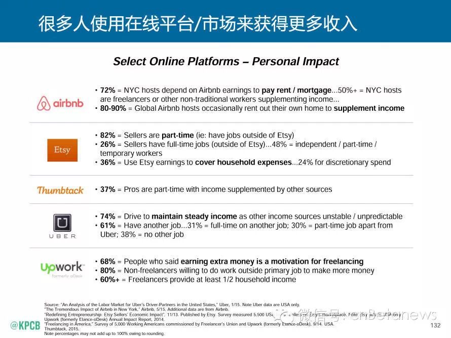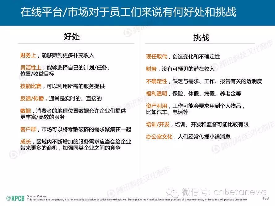 在线平台/市场发展迅速,为个人创造了新的就业机会也提出了新的挑战。这个趋势将继续上升,就像第一代互联网公司引发的趋势和造成的影响一样,可能越来越快也越来越宽。 (来自:腾讯科技)