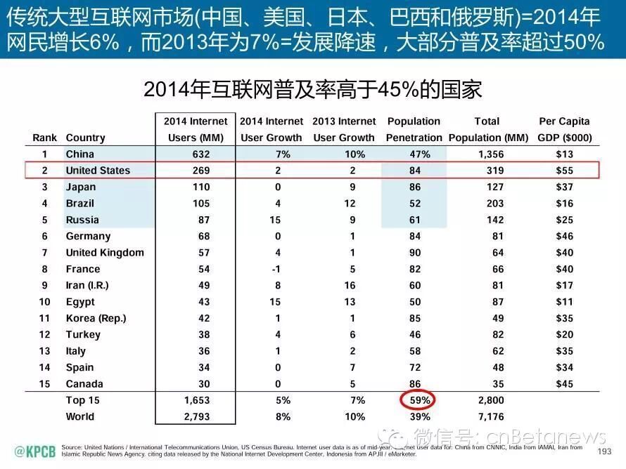 传统大型互联网市场(中国、美国、日本、巴西和俄罗斯)=2014年网民增长6%,而2013年为7%=发展降速,大部分普及率超过50% (来自:腾讯科技)