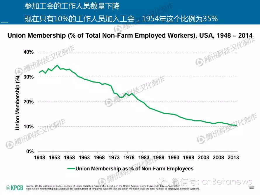现在只有10%的工作人员加入工会,1954年这个比例为35%。 (来自:腾讯科技)
