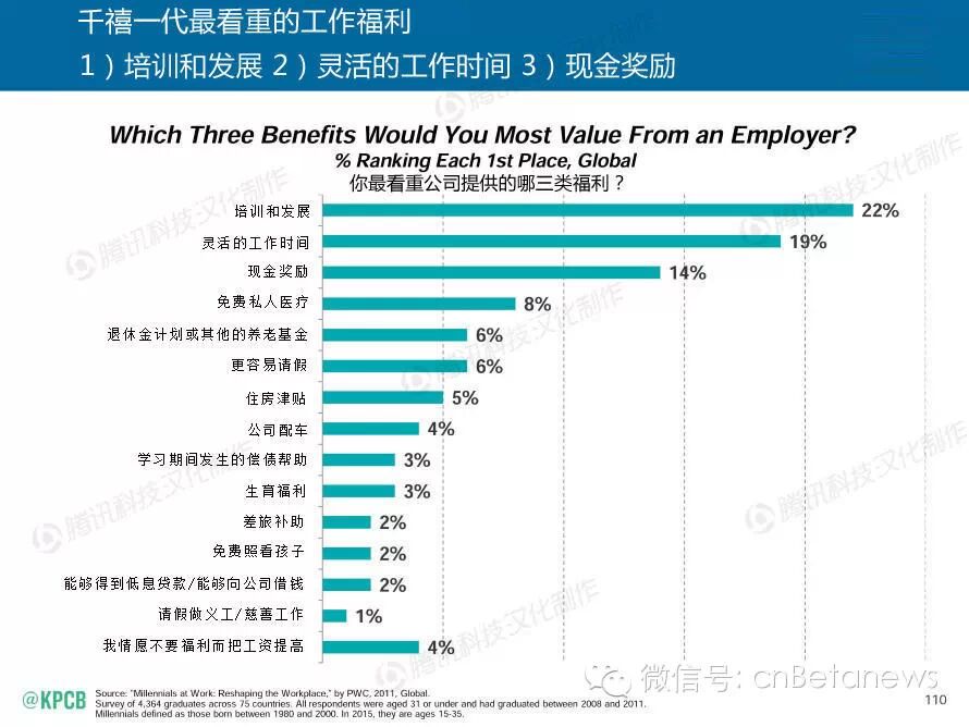千禧一代最看重的工作福利:1)培训和发展 2)灵活的工作时间 3)现金奖励 (来自:腾讯科技)