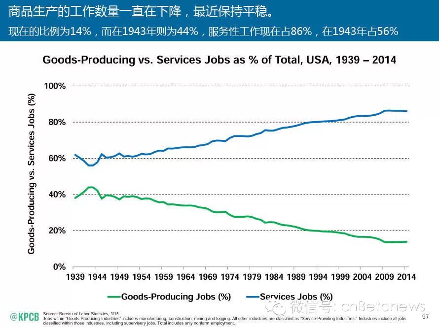 商品生产的工作数量一直在下降,最近保持平稳。现在的比例为14%,而在1943年则为44%,服务性工作现在占86%,在1943年占56% (来自:腾讯科技)