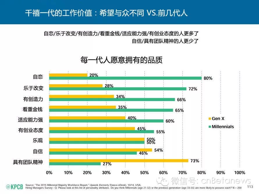 千禧一代的工作价值,希望与众不同,自恋/乐于改变/有创造力/看重金钱/适应能力强/有创业态度的人更多了,自信/具有团队精神的人更少了 (来自:腾讯科技)