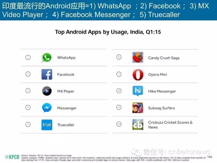 印度最流行的Android应用=1) WhatsApp ;2) Facebook; 3) MX Video Player; 4) Facebook Messenger; 5) Truecaller (来自:腾讯科技)