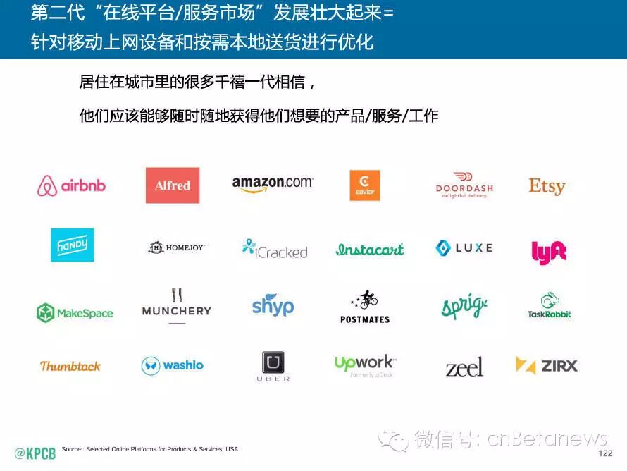 第二代“在线平台/服务市场”发展壮大起来,针对移动上网设备和按需本地送货进行优化。 (来自:腾讯科技)