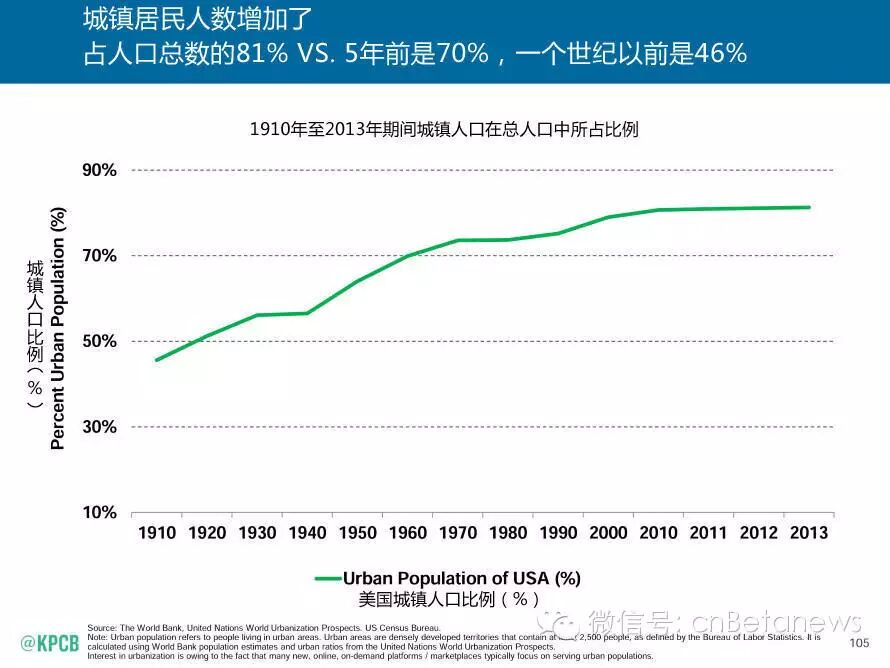 城镇居民人数增加了,一个世纪占人口总数的46%,一个世纪以前是46%,现在则是81%。 (来自:腾讯科技)