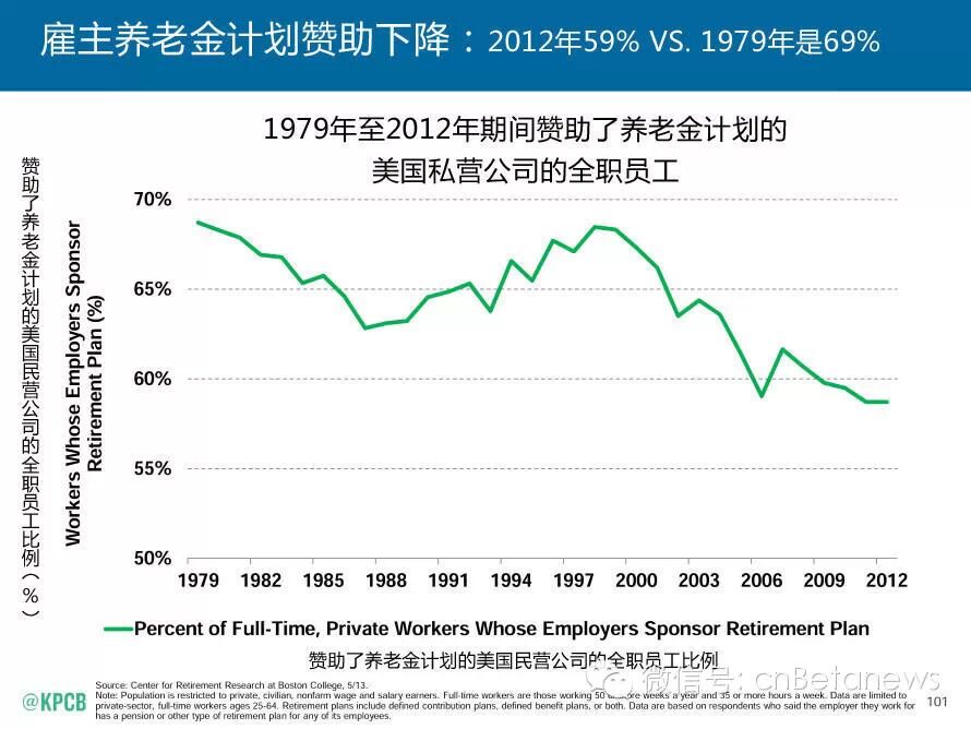 雇主养老金计划赞助下降,1979年是69%,2012年是59%。 (来自:腾讯科技)