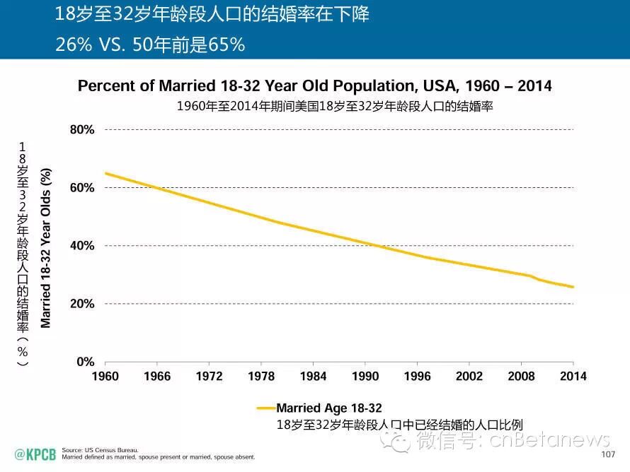18岁至32岁年龄段人口的结婚率在下降,50年前是65%,现在则是26%。 (来自:腾讯科技)