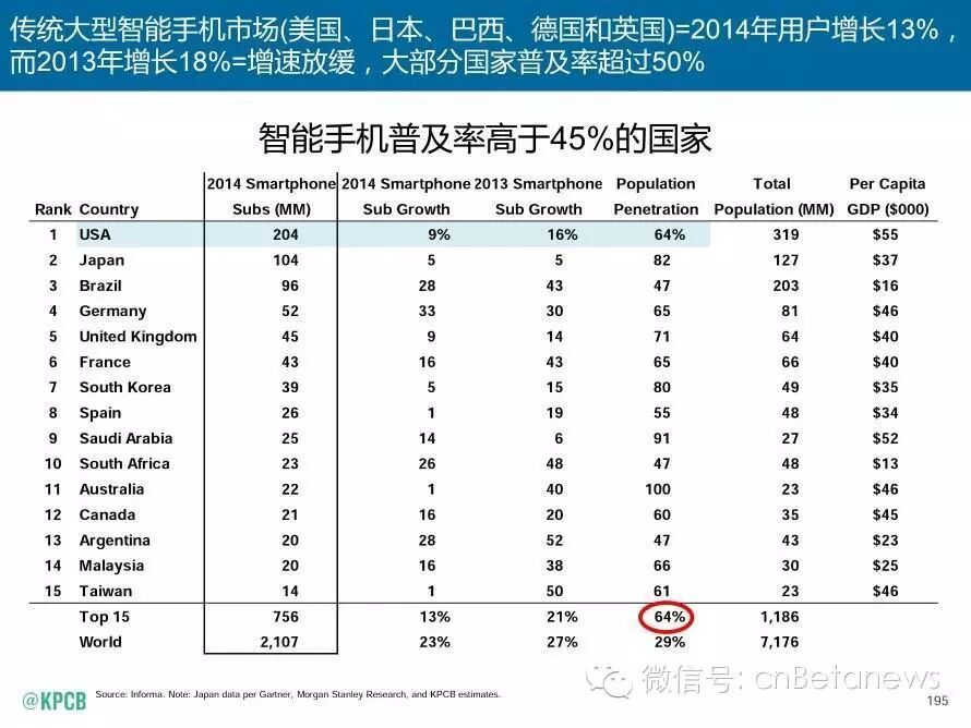 传统大型智能手机市场(美国、日本、巴西、德国和英国)2014年用户增长13%,而2013年增长18%,增速放缓,大部分国家普及率超过50% (来自:腾讯科技)