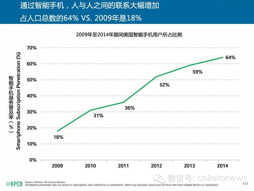 通过智能手机,人与人之间的联系大幅增加,智能手机普及率达到64%,2009年是18%。 (来自:腾讯科技)