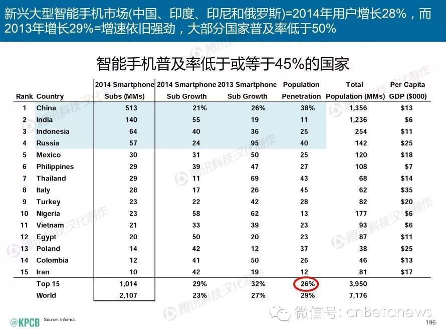 新兴大型智能手机市场(中国、印度、印尼和俄罗斯)2014年用户增长28%,而2013年增长29%,增速依旧强劲,大部分国家普及率低于50% (来自:腾讯科技)