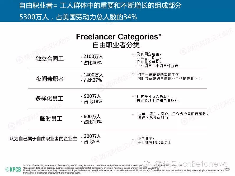 自由职业者成为工人群体中的重要和不断增长的组成部分,全美自由职业者有5300万人,占美国劳动力总人数的34%。 (来自:腾讯科技)