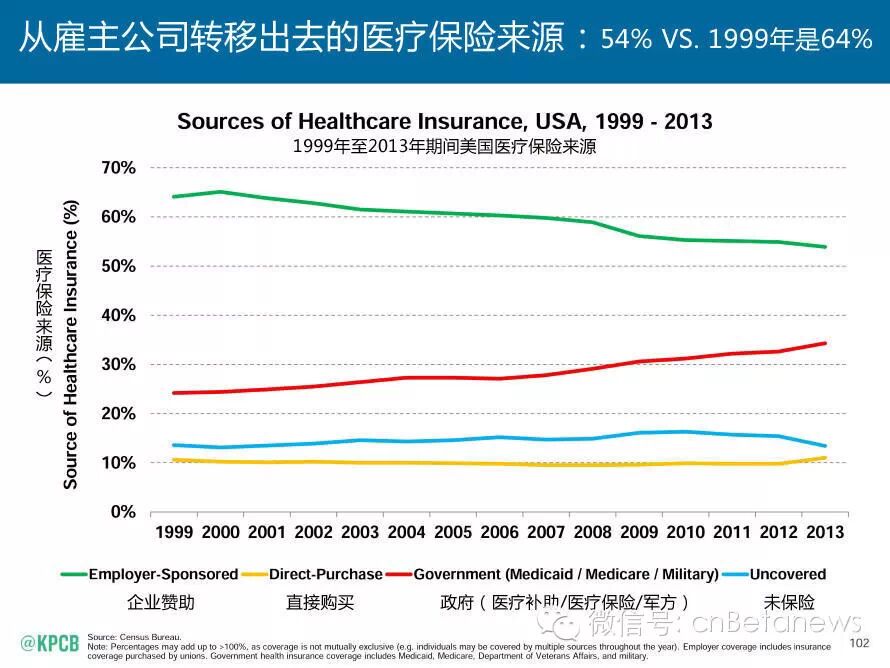 从雇主公司转移出去的医疗保险来源,1999年是64%,现在是54% (来自:腾讯科技)