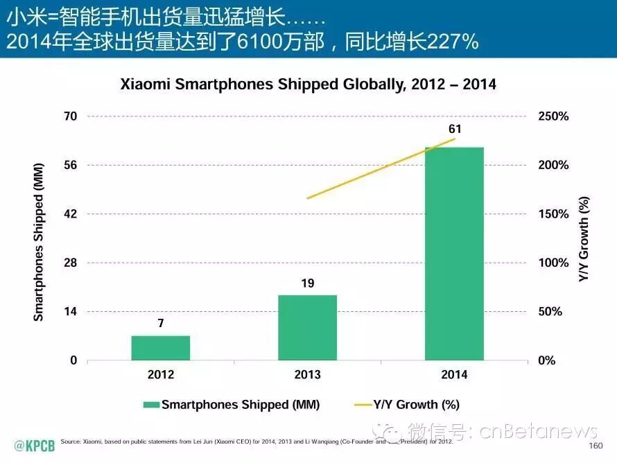 小米智能手机出货量迅猛增长,2014年全球出货量达到了6100万部,同比增长227% (来自:腾讯科技)