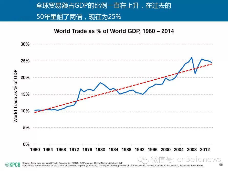 全球贸易额占GDP的比例一直在上升,在过去的50年里翻了两倍,现在为25% (来自:腾讯科技)