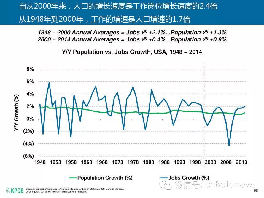 自从2000年来,人口的增长速度是工作岗位增长速度的2.4倍。从1948年到2000年,工作的增速是人口增速的1.7倍。 (来自:腾讯科技)
