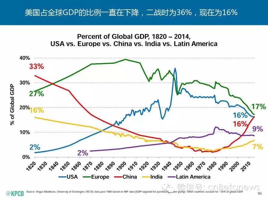 美国占全球GDP的比例一直在下降,二战时为36%,现在为16% (来自:腾讯科技)