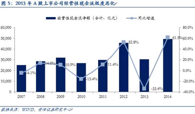 而2013年年报显示,A股全部上市公司经营活动产生的现金流净额陡降至30603亿元,同比下降33.4%,造成上市公司现金流极度恶化,因此,2014年,A股上市公司对于资金的诉求非常强烈。