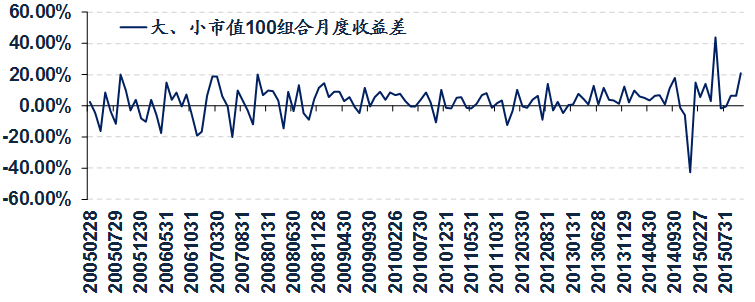 构建代表大、小盘风格的组合,选股的样本覆盖了2005年-2015年10月间上市的共2780个股票。在每个月的最后一个交易日,按照总市值对所有股票排序,将最小和最大的各100个以等权重加权的方式形成小市值和大市值组合。下图是这两个组合月度收益差(小市值-大市值)的变化。在前1/2的时间内,两种风格似乎交替占优。但进入二十一世纪第二个十年后,小市值组合占据了明显的优势。尤其是2013年至今,只有2014年12月份出现过明显的风格切换,这一现象不禁让人有些惊讶。