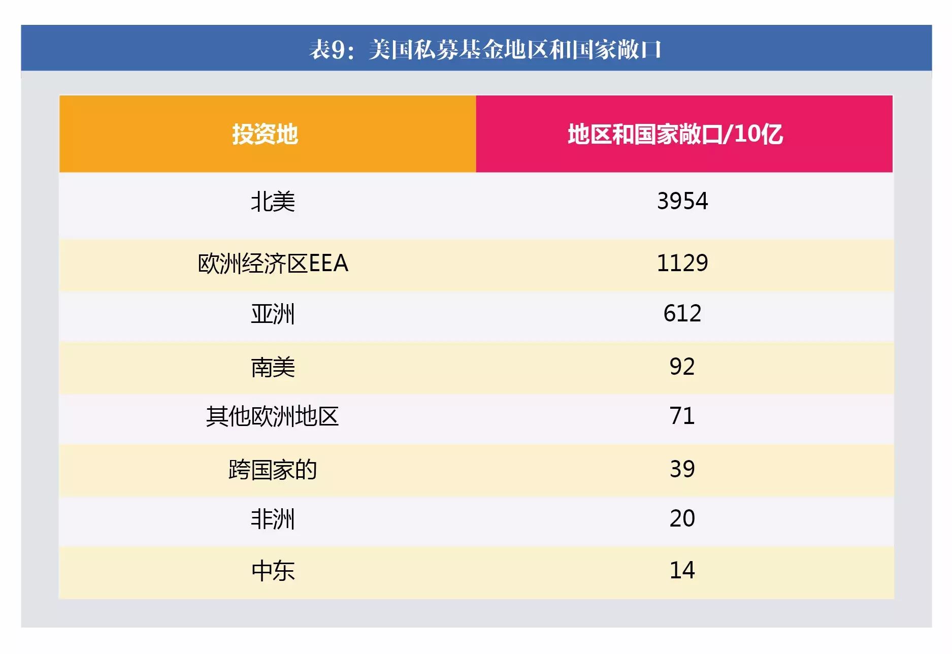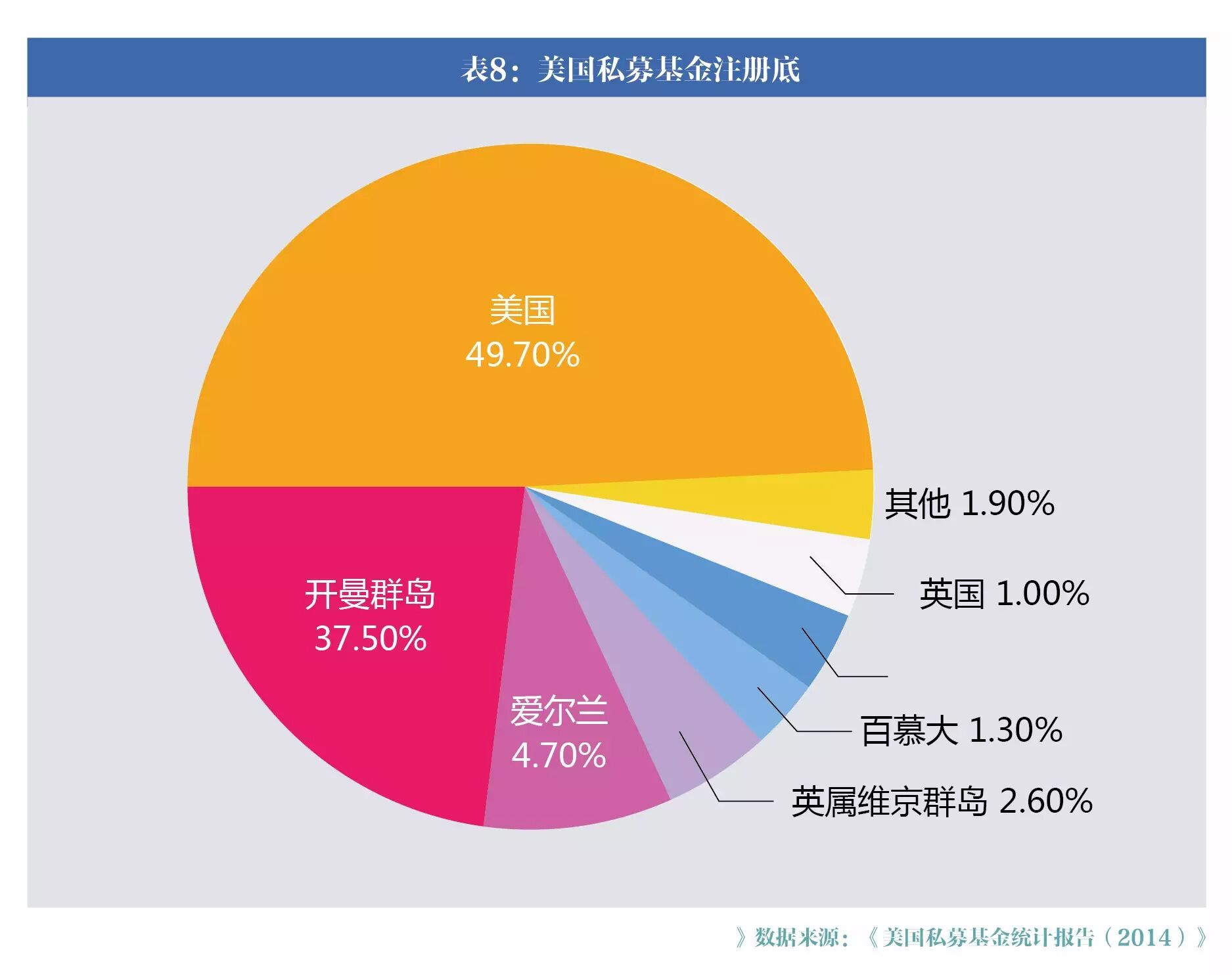 美国私募基金的注册地和投资地呈现全球分布,私募基金的注册地主要分布在美国、开曼群岛、爱尔兰、维尔京、百慕大等地。其中开曼、爱尔兰、维尔京、百慕大等地是著名的避税港,美国私募基金利用避税港进行避税。美国私募基金的风险敞口也是全球分布,体现美国私募基金全球化投资的特点。中国的私募基金基本都在国内注册,只有5家在香港注册,不过近年来国内私募机构的境外投资在逐渐增多。