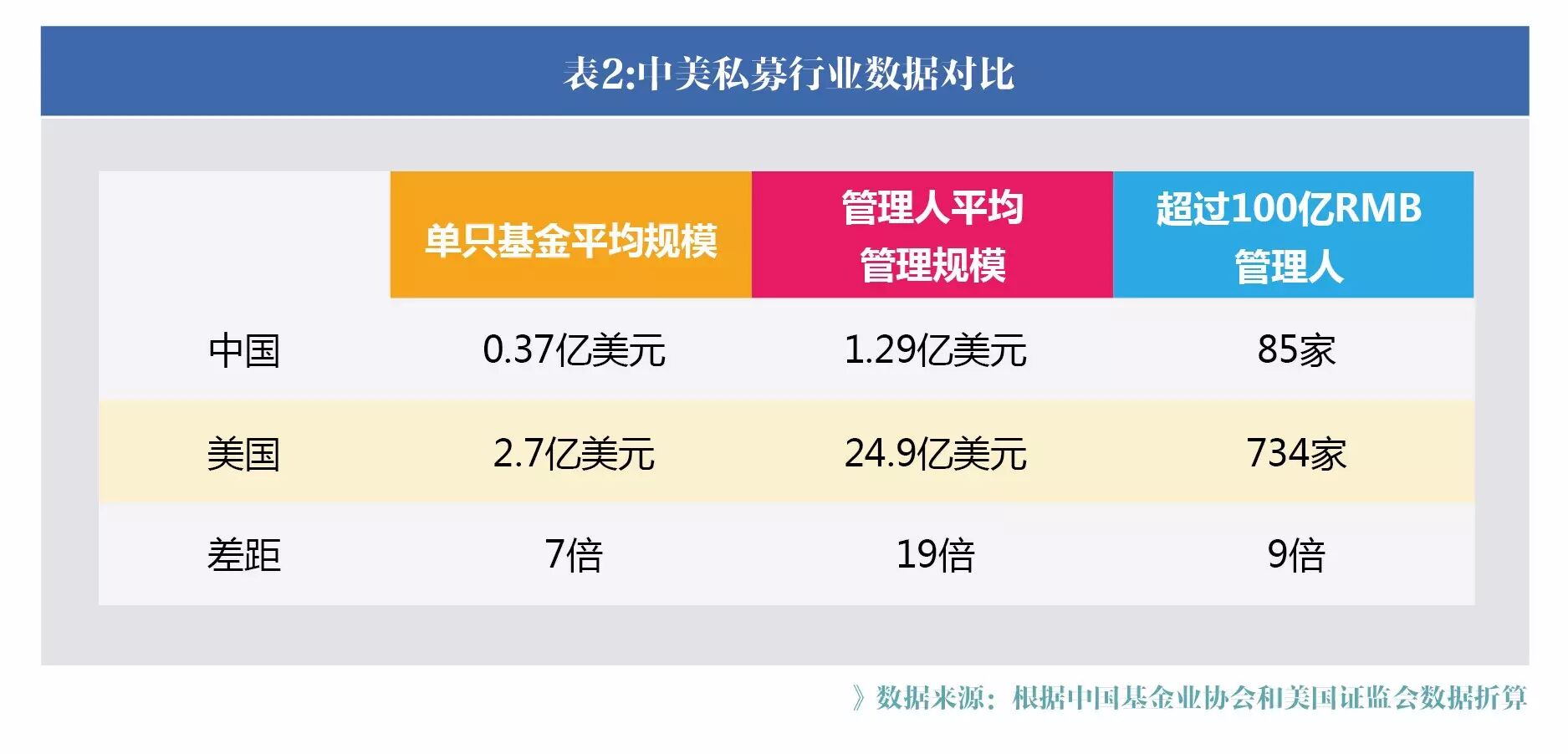 从平均数据可以看出,国内单只基金规模和管理人平均管理规模与美国都有较大差距,管理规模超过100亿人民币的大型私募机构数量也远落后于美国,由此可见中国私募基金行业还处于起步阶段,未来还有很长的路要走。