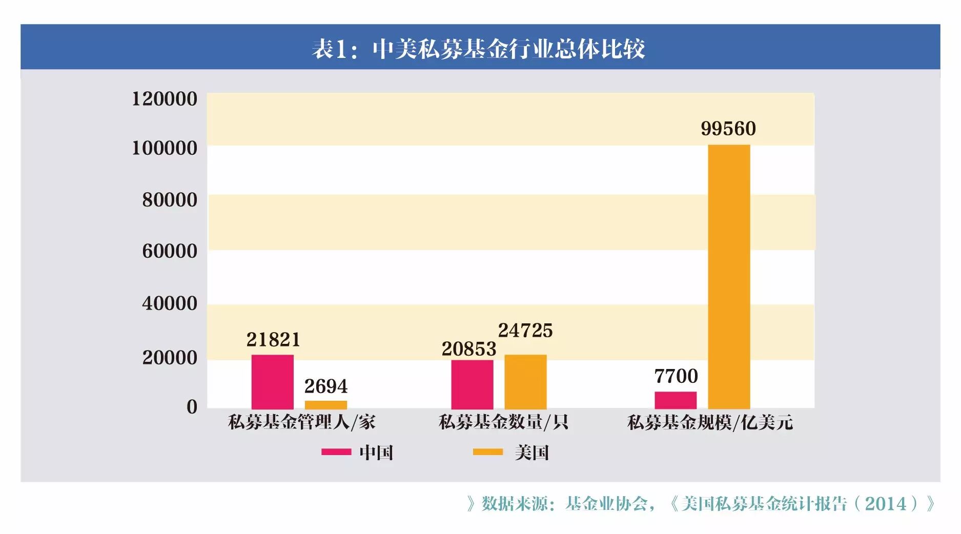 从总体数据上看,截止2014年底,在美国证监会登记的私募管理人2694家,管理基金24725只,管理总资产9.96万亿美元,净资产6.71万亿美元。基金业协会的数据显示,截止2015年10月末,备案登记的私募基金管理人21821家,管理基金20853只,管理资产4.9万亿人民币(约7700亿美元)。