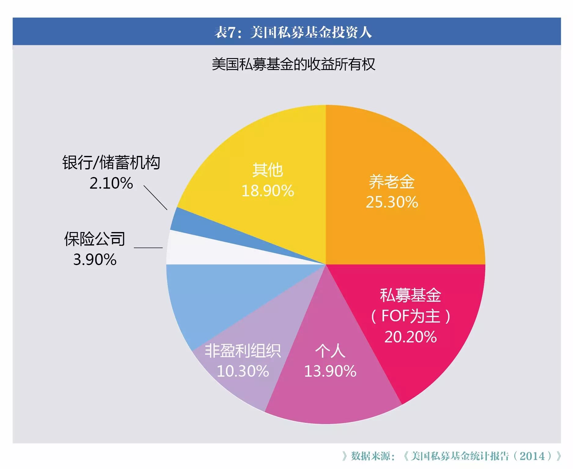 从美国私募基金收益所有权结构可以看出,养老基金是私募基金的最大投资人,州或市政养老金占比12.8%,养老金计划占比12.5%,合计占比25.3%,而私募基金本身(包括FOF、基金管理人出资及跟投基金)占20.2%,而FOF背后的出资人主要是养老基金为首的机构投资者为主。因此,养老基金是私募基金最大的投资人。个人投资者只占13.9%。未来随着我国养老金对私募基金的逐步放开,养老金也会成为我国私募基金重要的投资者。